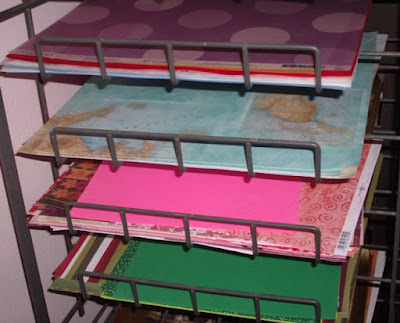 I'm still sorting through the paper and putting it in the trays. I have some boxes of paper to go through yet. I want to make some tags to mark the trays by color and specialty. They are sorted by speciality (all colors), color with paper to the left and cardstock to the right. This makes it easy to find what I need. The trays are immediately to the left when entering the room.