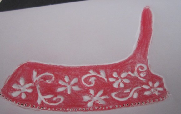 So now that I have an excuse to play with the pergamano tools again. The tools are needles in a handle and embossing tools. Today I copied a simple pattern to vellum and practiced on it. The basics of the craft is to outline an image with white or gold ink using a old fashion pen. I cheat and use a white gel pen. Next you place the image right side down and use the embossing tools on the image and it causes the work to pop up on the rightside. It also causes the vellum paper to become white where it has been embossed. Then you use the needle tools to create patterns and in some cases punch areas away. It is like doing white work embroidery only with paper.